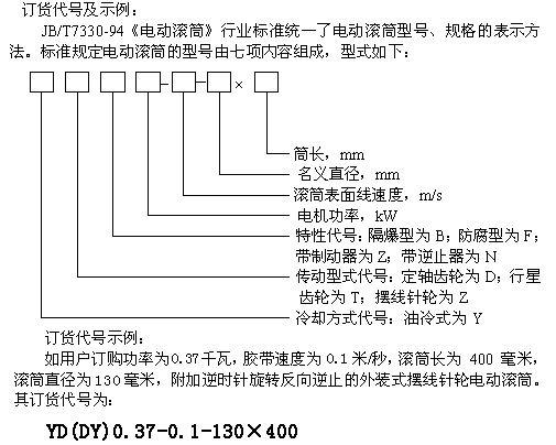 (2).用戶訂購逆止電動(dòng)滾筒時(shí),須注明旋轉(zhuǎn)方向,如不注明則為任意方向。其表示方法為在特性代號(hào)后加“S”(表示在電機(jī)引出線一側(cè)觀察,端蓋應(yīng)順時(shí)針旋轉(zhuǎn))或“N”(表示在電機(jī)引出線一側(cè)觀察,端蓋應(yīng)逆時(shí)針旋轉(zhuǎn))。